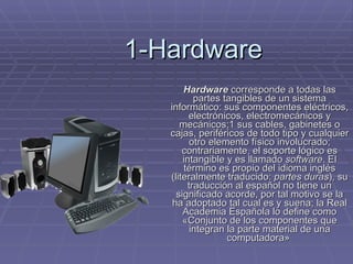 Este documento describe los componentes básicos del hardware de una computadora, incluyendo la placa base, periféricos y otros accesorios. También describe los sistemas operativos más comunes como Windows y Linux, y define una red como un sistema de comunicaciones que conecta varias unidades para compartir información. Por último, explica las aplicaciones básicas de ofimática como procesadores de texto, hojas de cálculo y bases de datos.