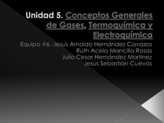 Este documento resume conceptos clave sobre los estados de la materia gaseosa. Explica que los gases pueden ser ideales o reales, y describe las leyes de Boyle, Charles y Gay-Lussac, las cuales establecen las relaciones entre la presión, volumen y temperatura de los gases. También cubre conceptos como la termoquímica, calor de reacción, disolución y electroquímica.
