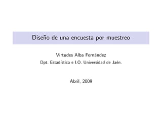 Este documento describe los conceptos y etapas clave en el diseño de una encuesta por muestreo. Explica la diferencia entre censo y muestra, los tipos de muestreo probabilístico y no probabilístico, y los errores de muestreo. También cubre el diseño del cuestionario, los tipos de preguntas, y los métodos para la obtención de información como las entrevistas personales, telefónicas y por correo. Por último, destaca la importancia de realizar una encuesta piloto para garantizar la calidad del cuestionario