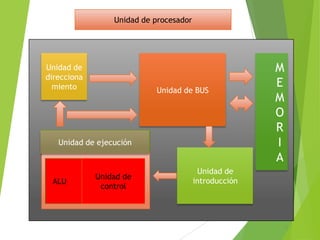 La computadora está compuesta por una unidad de procesador central que incluye una unidad de control, una unidad de direccionamiento, una unidad de ejecución con una ALU y una unidad de introducción, todo conectado por una unidad de BUS a la memoria.