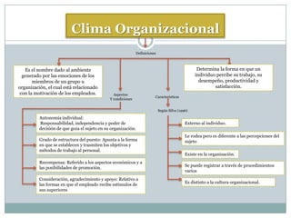 Este documento trata sobre el clima organizacional. Define el clima organizacional como el ambiente generado por las emociones de los miembros de una organización, relacionado con la motivación de los empleados. Explica que el clima organizacional determina cómo los individuos perciben su trabajo y desempeño. Además, describe técnicas para medir el clima organizacional como encuestas y entrevistas, e identifica factores que pueden afectar el clima como el ambiente físico, las estructuras, la comunicación y el liderazgo.