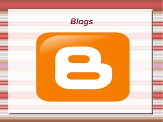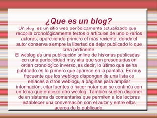 El documento proporciona información sobre blogs y cómo crear uno. Explica que un blog es un sitio web actualizado periódicamente que recopila artículos de uno o más autores en orden cronológico inverso. Luego detalla los pasos para crear una cuenta de Google y un blog en Blogger, incluido cómo agregar entradas, imágenes, enlaces y dar formato al blog.