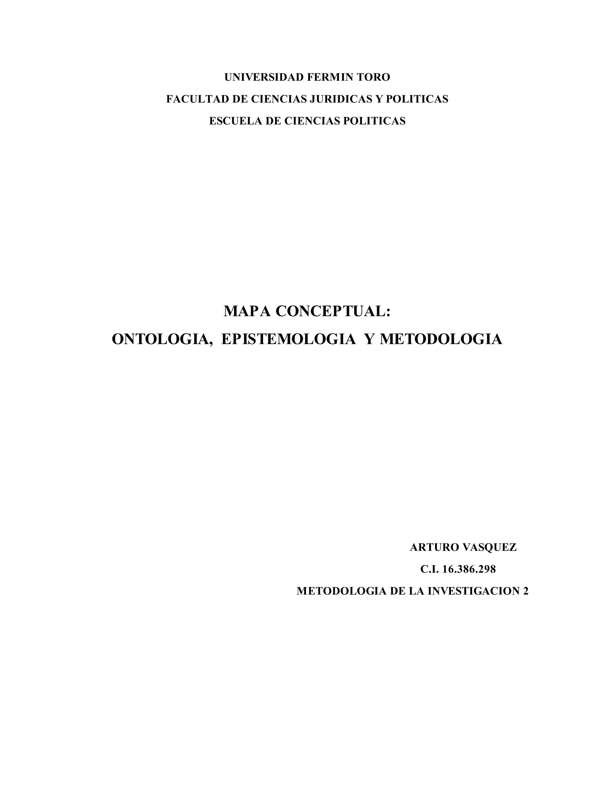 Este documento presenta un mapa conceptual sobre ontología, epistemología y metodología para la asignatura de Metodología de la Investigación 2. El mapa conceptual fue desarrollado por Arturo Vásquez para la Facultad de Ciencias Jurídicas y Políticas de la Universidad Fermín Toro.