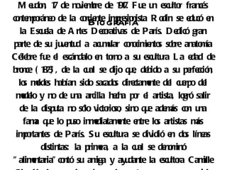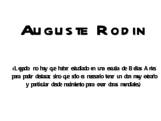 Auguste Rodin fue un escultor francés nacido en 1840 que revolucionó el arte escultórico. Sus obras más famosas incluyen Las Puertas del Infierno, El Pensador y El Beso. Rodin utilizaba el cuerpo humano para expresar la psicología y los sentimientos. Aunque sus esculturas parecían realistas, a menudo usaba materiales poco convencionales como el yeso y el plastilina.