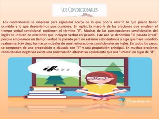 Este documento describe los cinco tipos principales de oraciones condicionales en inglés: condicional cero, condicional tipo 1, condicional tipo 2, condicional tipo 3 y condicional mixto. Para cada tipo, explica la estructura gramatical, incluyendo los tiempos verbales utilizados en cada cláusula, y proporciona ejemplos para ilustrar su uso.