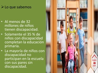 El documento destaca que al menos 32 millones de niños tienen discapacidad pero solo el 35% de ellos completan la educación primaria, y la mayoría no asisten a la escuela con sus pares sin discapacidad, debido a que existen barreras y obstáculos que impiden que puedan asistir, pertenecer, participar y aprender en el sistema educativo.