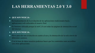 Este documento describe las herramientas web 2.0 y 3.0. Explica que la Web 2.0 permite la interacción social y participación de los usuarios a través de blogs, wikis y redes sociales. También describe las características de la Web 3.0 como la inteligencia artificial y semántica para comprender mejor los datos. Además, enumera diversas herramientas web 2.0 como YouTube, Flickr y SlideShare y explica cómo crear cuentas y canales en algunas de estas plataformas.