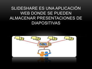 SlideShare es una aplicación web gratuita donde los usuarios pueden almacenar y compartir presentaciones de diapositivas. Los usuarios pueden crear una cuenta, cargar archivos de presentaciones como PowerPoint o OpenOffice, y publicarlos en SlideShare para que otros puedan verlos y enlazarlos desde su sitio web u otro lugar. SlideShare ofrece características como espacio de almacenamiento gratuito y la opción de convertir las presentaciones a formato flash una vez publicadas.