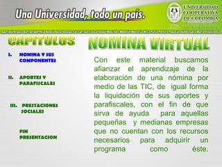 Este documento explica cómo una nómina virtual puede ayudar a las pequeñas y medianas empresas a liquidar los salarios de sus empleados y realizar los aportes y deducciones requeridos de manera más eficiente. Describe los componentes clave de una nómina como los nombres, identificaciones, días trabajados, devengos, deducciones y pagos netos de los empleados, así como los aportes parafiscales, seguridad social, prestaciones sociales y provisiones que debe realizar la empresa. El objetivo es proporcionar una herramienta útil