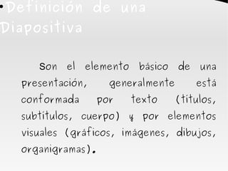 Este documento define una diapositiva como el elemento básico de una presentación, generalmente compuesta por texto y elementos visuales. Define una presentación como un conjunto de diapositivas para expresar ideas ante un público de manera ágil y atractiva, de forma similar a cómo un libro está compuesto de páginas y una presentación de diapositivas. Además, menciona el ambiente de Impress.