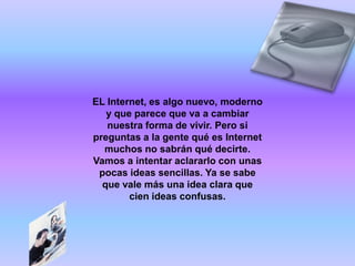 Este documento proporciona una introducción general a Internet, explicando que es una red mundial de ordenadores interconectados que pueden compartir información a través del protocolo TCP/IP. Describe los componentes necesarios para conectarse a Internet, como los proveedores de servicios y navegadores web. Además, resume los principales servicios y herramientas que ofrece Internet, como correo electrónico, chat, mensajería instantánea, foros, blogs y redes sociales.