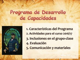 Este documento describe un programa de enriquecimiento para alumnos dotados y talentosos. El programa se centra en desarrollar al máximo las capacidades de los alumnos a través de talleres flexibles que cubren diversas áreas como las matemáticas, ciencias, artes y habilidades sociales. Las actividades incluyen proyectos, juegos, experimentos y debates con el objetivo de estimular la creatividad y el razonamiento de los alumnos. El progreso de los alumnos se evalúa continuamente para garantizar el éxito del programa.