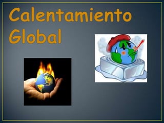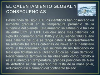 El documento describe cómo la temperatura promedio de la Tierra ha aumentado entre 0.5°F y 1.0°F desde fines del siglo XIX, debido al aumento de gases de efecto invernadero como el CO2 producto de la quema de combustibles fósiles. Este calentamiento global está derritiendo los témpanos de hielo del Ártico y separando grandes porciones de hielo de la Antártida, además de elevar las temperaturas mundiales.