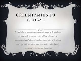El calentamiento global es el aumento de la temperatura de la atmósfera y los océanos debido a los contaminantes en el aire que forman una capa gruesa atrapando el calor del sol. Sus consecuencias incluyen el derretimiento de glaciares, sequías, desiertos y eventos climáticos extremos. Aunque hay ciclos naturales, la cantidad de calentamiento no puede explicarse sin incluir los gases de efecto invernadero emitidos por humanos.