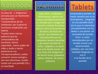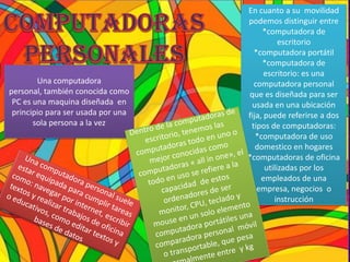Existen tres tipos principales de computadoras personales: las computadoras de escritorio, las laptops y las netbooks. Las computadoras de escritorio son estacionarias y se usan típicamente en el hogar o la oficina. Las laptops son portátiles y más livianas, aunque menos potentes que las de escritorio. Las netbooks son aún más pequeñas y livianas que las laptops, y se usan principalmente para navegar por Internet y aplicaciones básicas.