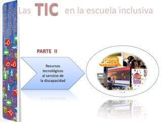 Este documento discute el uso de recursos tecnológicos y TIC para apoyar a estudiantes con discapacidades en escuelas inclusivas. Explica cómo las TIC pueden facilitar la comunicación, el acceso a la información, el desarrollo cognitivo y el aprendizaje. También describe algunas discapacidades físicas, psíquicas y mentales y actividades propuestas para el uso de blogs, recursos audiovisuales, presentaciones multimedia y documentos electrónicos con el fin de apoyar la integración e inclusión educ