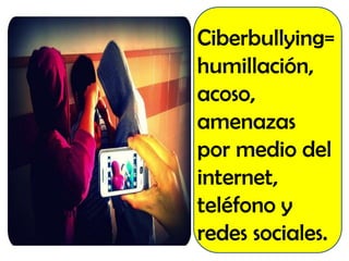 El ciberbullying se define como humillación y acoso a través de internet y redes sociales, con causas que incluyen la ignorancia y el anonimato. Tiene graves consecuencias como la baja autoestima, depresión y, en casos extremos, suicidio. Para prevenirlo, se enfatiza la importancia de la educación, la responsabilidad de las acciones y la búsqueda de ayuda.
