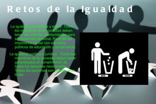El documento discute los retos de la igualdad económica, social, política y jurídica en la sociedad. También aborda conceptos como la solidaridad, discriminación, exclusión social, causas de la discriminación, problemas de coexistencia como el racismo y la xenofobia, y formas de resolver la convivencia entre culturas como la multiculturalidad e interculturalidad. Finalmente, analiza la igualdad entre hombres y mujeres y las leyes de protección a las mujeres.