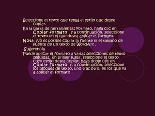 Este documento proporciona instrucciones sobre cómo cambiar el estilo, formato y apariencia de elementos en Microsoft PowerPoint y Office. Incluye cómo copiar formatos de texto, activar revisiones de estilo, cambiar el estilo de toda una presentación, y modificar opciones de revisión de estilo. También explica cómo agregar o quitar efectos de relieve de texto, cambiar estilos de viñetas y numeración predeterminados, y utilizar imágenes como viñetas.