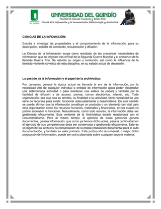 Este documento presenta los fundamentos de la Ciencia de la Información, la Archivística y la Bibliotecología. Explica que la Ciencia de la Información estudia las propiedades y el comportamiento de la información para su descripción, análisis, recuperación y difusión. La Archivística estudia la naturaleza de los archivos, sus principios de conservación y organización. La Bibliotecología estudia los sistemas de ordenamiento y disposición de libros en las bibliotecas. Además, analiza la evolución de estas