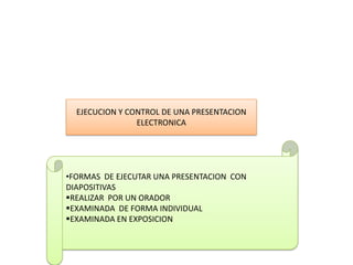 Este documento describe diferentes formas de ejecutar y controlar presentaciones electrónicas, incluyendo realizarlas a través de un orador, examinar diapositivas individualmente o en exposición, o configurar presentaciones automáticas con intervalos, hipervínculos o narración sonora. También cubre trabajar con presentaciones en Internet a través de PowerPoint para la Web o un reproductor de animaciones, e incluye información sobre hipervínculos, macros y objetos OLE.