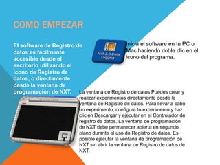 El documento proporciona instrucciones para iniciar el software de registro de datos de NXT, describe la interfaz de usuario incluyendo las herramientas de predicción, recopilación de datos y análisis, y enumera los componentes necesarios para construir un modelo con un surfista.