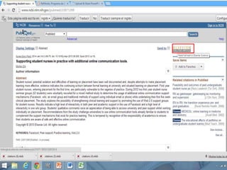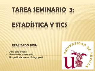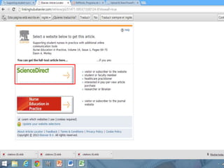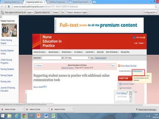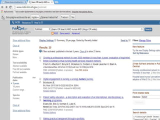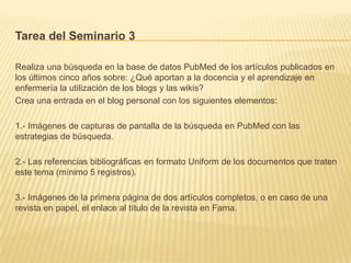 Este documento resume una tarea de seminario sobre el uso de blogs y wikis en la enseñanza de enfermería. Incluye una búsqueda en PubMed de artículos de los últimos 5 años sobre este tema, con capturas de pantalla. Se proporcionan 5 referencias bibliográficas en formato Uniform y capturas de la primera página de dos artículos completos con enlaces a sus páginas web. Finalmente, muestra las estrategias utilizadas para importar los documentos de PubMed a Refworks y crear la bibliografía.