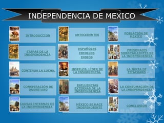 La independencia de México fue el resultado de varios factores internos y externos. Internamente, había descontento por la desigualdad social y económica entre españoles, criollos e indígenas. Externamente, las ideas de la Ilustración y las revoluciones en Europa y América influyeron. La lucha por la independencia estuvo liderada por figuras como Miguel Hidalgo, Ignacio Allende y José María Morelos. Tras varios años de conflicto, en 1821 México finalmente se declaró independiente de España.