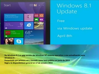 Windows 8.1 es una actualización de Windows 8 que presenta mejoras como una barra de tareas más fácil de usar, búsqueda mejorada, administrador de tareas y pantalla partida. Requiere al menos 1GB de RAM, 16GB de espacio en disco y una tarjeta gráfica compatible con DirectX 9 para su instalación. Incluye características de rendimiento como desfragmentación automática y seguridad mejorada con Windows Defender y OneDrive.