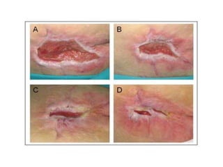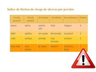 Este documento describe factores internos y externos que contribuyen a la formación de úlceras por presión y proporciona una escala de gravedad para clasificarlas. También ofrece recomendaciones para la prevención, que incluyen el uso de colchones especiales, la limpieza adecuada de la piel y la movilización regular del paciente. Además, brinda instrucciones para el cuidado básico de úlceras leves.