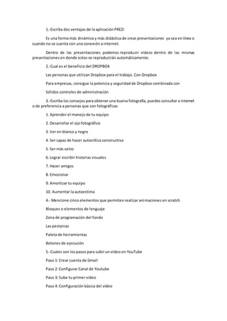 Prezi permite crear presentaciones de forma dinámica y didáctica en línea o sin conexión, y reproducir videos dentro de las presentaciones de manera automática. Dropbox proporciona almacenamiento en la nube seguro para empresas con controles de administración sólidos. Para obtener buenas fotografías, es importante aprender el equipo, desarrollar el ojo fotográfico, hacer autocrítica constructiva y emocionar con historias visuales. Scratch permite realizar animaciones mediante bloques de programación, la zona de fondo, pest