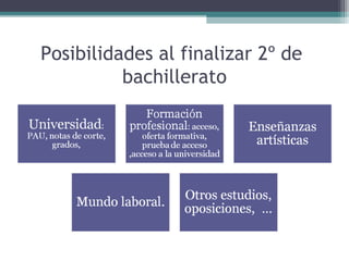 El documento proporciona información sobre las posibilidades educativas y profesionales al finalizar el segundo curso de bachillerato, incluyendo detalles sobre la Formación Profesional de Grado Superior, la Prueba de Acceso a la Universidad y la Formación Profesional Dual.