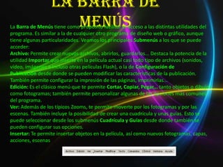 La barra de menús permite acceder a las utilidades del programa como crear y abrir archivos, cortar y pegar objetos, insertar nuevos elementos en la película, modificar gráficos y propiedades de reproducción. La barra de herramientas incluye herramientas básicas como selección, línea, texto, óvalo y rectángulo, así como herramientas de dibujo como lápiz, brocha y borrador. Las ventanas acoplables contienen herramientas y opciones de configuración para editar la animación
