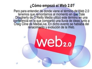 La Web 2.0 se refiere a la transición de aplicaciones tradicionales a aplicaciones enfocadas en el usuario y la colaboración. El término fue acuñado por Dale Dougherty en una conferencia en 2004 para describir la evolución y renacimiento de la Web, la cual ahora se basa más en tecnologías que permiten la interacción y compartir información. Aunque no existe una definición precisa, la Web 2.0 generalmente se caracteriza por plataformas que facilitan la publicación, el trabajo en red y la inteligencia colectiva.