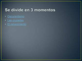 El documento describe tres períodos históricos: la Edad Media oscura, las Cruzadas y el Renacimiento. Durante la Edad Media oscura, la Iglesia Católica controlaba la educación y el sistema feudal dominaba la economía. Las Cruzadas permitieron que los campesinos escaparan del feudalismo y aprendieran a leer, dando inicio al mercantilismo. El Renacimiento cambió la forma de pensar colocando al hombre en el centro y desplazando a la Iglesia, sentando las bases para la Edad Moderna y el capitalismo actual.