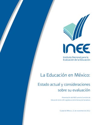 1) El documento describe el estado actual de la educación en México, señalando que aunque la cobertura de la educación primaria y secundaria es alta, aún hay brechas en el acceso a la educación preescolar y media superior, especialmente para los grupos vulnerables. 2) También indica que aunque los estudiantes mexicanos han mostrado mejoras leves en sus resultados de aprendizaje, estos siguen siendo bajos y existen grandes desigualdades entre grupos socioeconómicos. 3) Finalmente