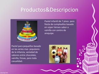 La repostería La Kake ofrece una variedad de pasteles, galletas, postres congelados y ponques para diferentes ocasiones como cumpleaños infantiles, matrimonios y quince años. Los pasteles incluyen opciones de varios pisos y sabores como vainilla, chocolate y arequipe, y están decorados con temas como superhéroes, series de TV o colores apropiados para cada ocasión. También ofrecen galletas simples o estilo flor, rellenas o bañadas en chocolate. Los postres congelados incluyen helados y brown