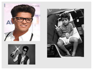 Este documento proporciona información biográfica y sobre la carrera musical de Bruno Mars. Nació en 1985 en Hawaii y comenzó a actuar y hacer música desde una edad temprana. Tras mudarse a Los Ángeles, coescribió canciones para otros artistas y lanzó su propio EP en 2010. Su álbum debut de 2011 Doo-Wops & Hooligans tuvo gran éxito comercial impulsado por sencillos como "Just The Way You Are" y "Grenade". Mars ha ganado varios premios Grammy y continúa co