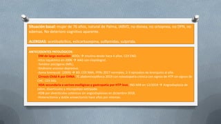 Este documento presenta el caso clínico de una mujer de 76 años que acude en varias ocasiones a urgencias por cefalea intensa en el lado derecho de la cabeza. Se sospecha neuralgia del trigémino y se realizan pruebas como TAC y RMN cerebrales que no muestran patología. Los tratamientos con carbamazepina, gabapentina y baclofeno no controlan adecuadamente el dolor. Finalmente es ingresada en neurología para ajuste de la medicación.