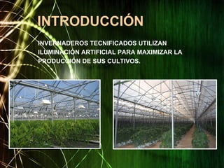 Este documento describe soluciones de iluminación para invernaderos que maximizan la producción de cultivos mediante la iluminación artificial. Los principales objetivos de I+D son desarrollar fuentes de luz más efectivas, mejorar los componentes electrónicos y estudiar el uso de energías renovables. El documento también explica diferentes tipos de iluminación, componentes como balastos electrónicos y reguladores de línea eléctrica, y el potencial de la iluminación LED y las energías renovables como la biomasa y la energía solar para proporcionar soluc
