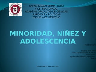 Este documento resume conceptos clave relacionados con la minoría, la niñez y la adolescencia desde una perspectiva jurídica. Explica que la minoría en Venezuela se define como no haber cumplido los 18 años y describe los conceptos de capacidad, patria potestad, filiación, guarda, mayoría de edad y emancipación. También resume brevemente el contenido de la Ley Orgánica para la Protección de Niños, Niñas y Adolescentes de Venezuela y conceptos relacionados con la adopción.