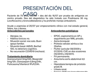 Este paciente de 79 años fue diagnosticado con COVID-19 y tratado en casa con corticoides y antibióticos. Acudió a urgencias con empeoramiento clínico, fiebre y disnea. Presenta neumonía por SARS-CoV-2 y EPOC aguda. Requiere oxígeno suplementario. Los análisis muestran empeoramiento y cultivo de esputo detecta hongos filamentosos.