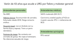 Este documento presenta el caso de un varón de 43 años que acude a urgencias con fiebre y malestar general. Tiene antecedentes de SAHS moderado y carcinoma urotelial tratado con RTU y BCG. Las pruebas realizadas incluyen analítica, radiografías, TC craneal y hemocultivos. Se ingresa en Medicina Interna para estudiar la causa de su fiebre prolongada y realizar una punción lumbar para descartar infección del SNC.