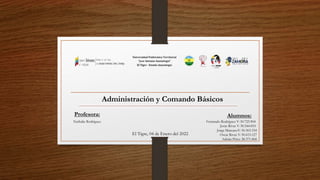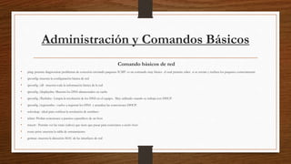 Este documento presenta una introducción a los comandos y conceptos básicos de administración en sistemas operativos. Explica comandos de red, administración de Windows, atajos, comandos para verificar problemas de dominio, y define conceptos como procesos, estados de procesos, creación y destrucción de procesos, y los recursos que administra un sistema operativo.