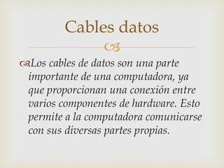 Los cables de datos son una parte importante de las computadoras ya que permiten la comunicación entre los componentes de hardware. Los principales cables de datos incluyen cables FDD para conectar unidades de disquete, cables IDE de 40 hilos para conectar discos duros y unidades ópticas, y cables SATA más modernos de 7 contactos para unidades SATA.