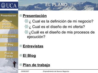 El documento presenta un resumen del plan de negocio para un blog sobre centros de ski llamado Ski World. Explica que el blog ofrecerá una base de datos sobre centros de ski en varios países llenada por los usuarios, con comentarios sobre pistas, restaurantes, vida nocturna y más. También analiza la competencia y concluye que entrevistas con esquiadores revelaron que buscan recomendaciones y ponerse en contacto con otros a través del blog.
