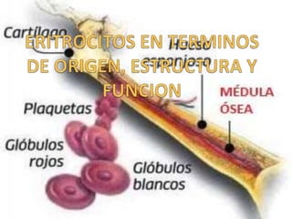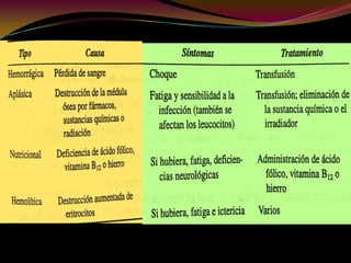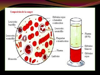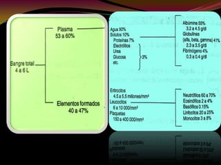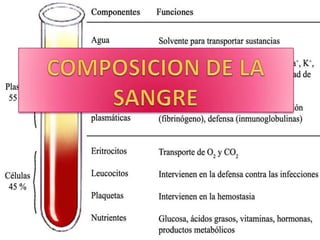 El documento resume las principales funciones de la sangre, incluyendo el transporte, regulación ácida-base, termorregulación e inmunidad. Explica el proceso de formación de eritrocitos en la médula ósea y plaquetas a partir de megacariocitos. Describe los componentes de la sangre como plasma y células, y los tipos de leucocitos. Resume los factores de la coagulación sanguínea y cómo funcionan las plaquetas.