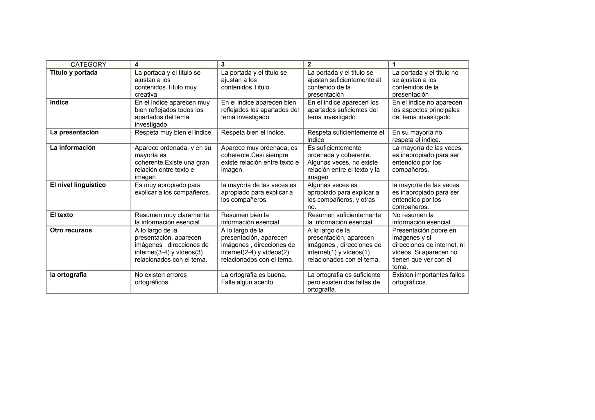 Este documento evalúa diferentes presentaciones según varios criterios como la portada, el índice, la organización del contenido, el nivel lingüístico y la ortografía. Se clasifican las presentaciones en 5 categorías de 1 a 4, donde 1 es la peor calificación y 4 la mejor.