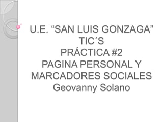 Este documento describe los marcadores sociales y sus características. Los marcadores sociales permiten almacenar enlaces web de forma organizada por categorías y etiquetas para poder acceder a ellos desde cualquier lugar con conexión a Internet. También permiten compartir enlaces con otros usuarios. Algunos usos comunes de los marcadores sociales son guardar recursos de Internet considerados útiles y categorizarlos con etiquetas, y conocer los favoritos de otras personas como fuente de información. Delicious, Tagzania, Flickr y About.me son ejemplos de servicios