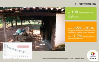 El documento describe el estado de la educación en Paraguay, resaltando los desafíos como la baja tasa de graduación, la falta de capacitación docente, la infraestructura deficiente y la escasez de recursos. También destaca los logros del proyecto Paraguay Educa para mejorar el acceso a la tecnología, capacitar a maestros, involucrar a las comunidades y apoyar a estudiantes. El proyecto busca promover una visión de Paraguay como una sociedad basada en el conocimiento.